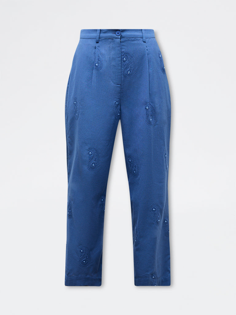 Bombay Paisley Blue Embroidered Cotton-Blend Palazzos