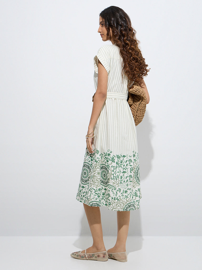 This green shirt dress from Bombay Paisley showcases a charming mix of striped prints and floral motifs. Created from a sumptuous cotton-linen blend in a flattering A-line silhouette, it features a V-neck collar and relaxed upturned dolman sleeves. A matching belt with a round buckle defines the waist, while side pockets offer everyday ease and functionality.