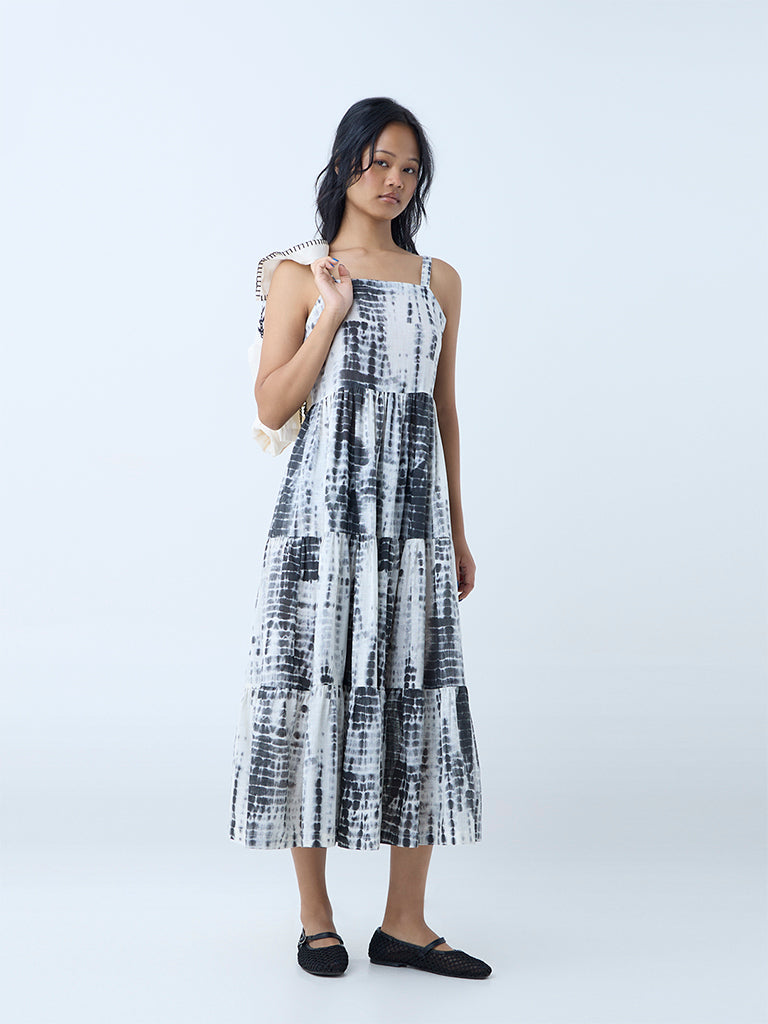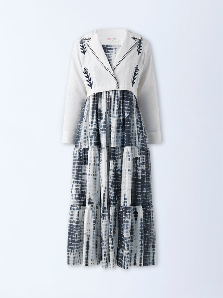 Bombay Paisley introduces this dark grey dress, reimagined in a tie-dye profile for a striking yet grounded aesthetic. Milled from pure cotton in a flowy tiered silhouette, it features a square neck with adjustable straps and a smocked back for ease and movement. The set is elevated with a matching jacket, adorned with floral embroidery, a notched lapel, and full sleeves.