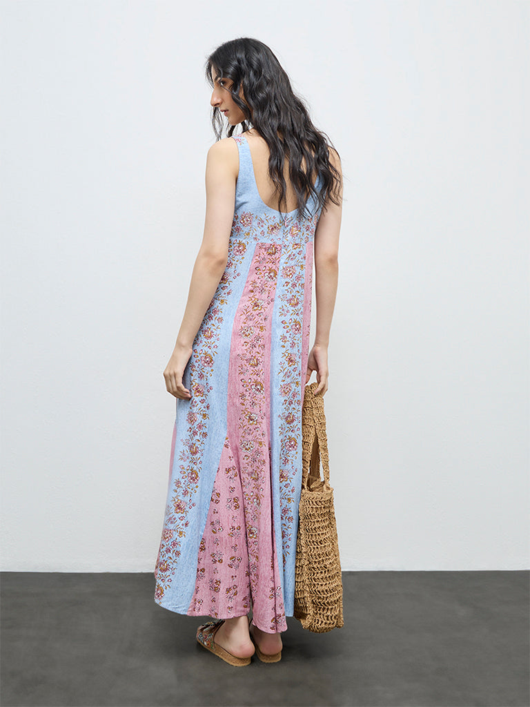 Channel effortless femininity in this multicolour dress from Bombay Paisley, patterned with delicate botanical motifs. Cut in a relaxed A-line shape, it features a plunging V-neck and sleeveless profile that feels airy and unfussy. Made from pure cotton, it is an easy pick for warm-weather dressing with a boho sensibility.