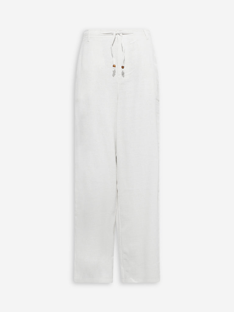 These off-white pants from Bombay Paisley blend everyday ease with understated charm. Woven from a cosy cotton-blend fabric, they feature a clean silhouette with an adjustable drawstring waistband for a comfortable fit. Multiple pockets complete the look with a touch of practical detail.