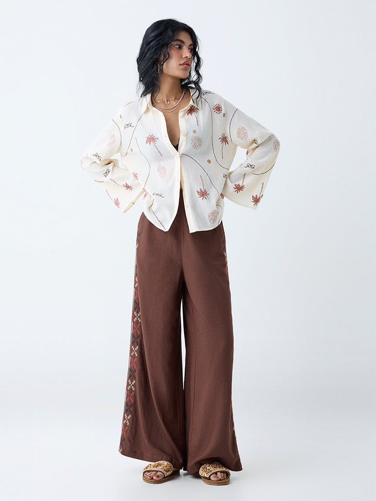 This off-white shirt from Bombay Paisley brings tropical energy to your wardrobe with its vibrant print. Cut from pure cotton, it’s styled with a structured collar and button-down front, while bell sleeves add a playful twist.