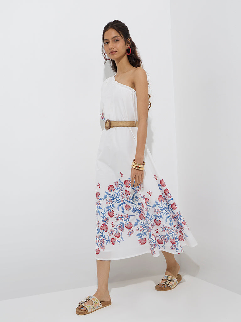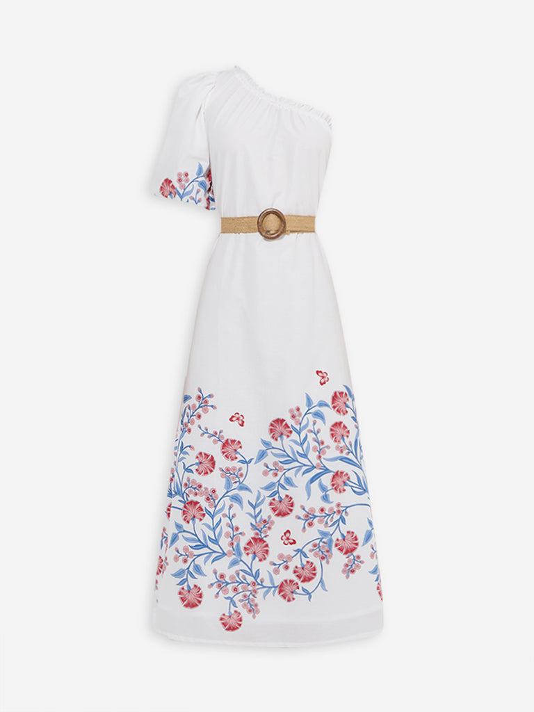 Bombay Paisley White Floral Cotton One-Shoulder Dress