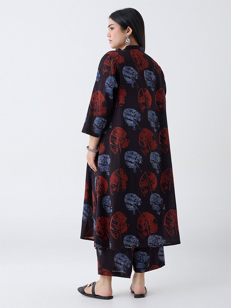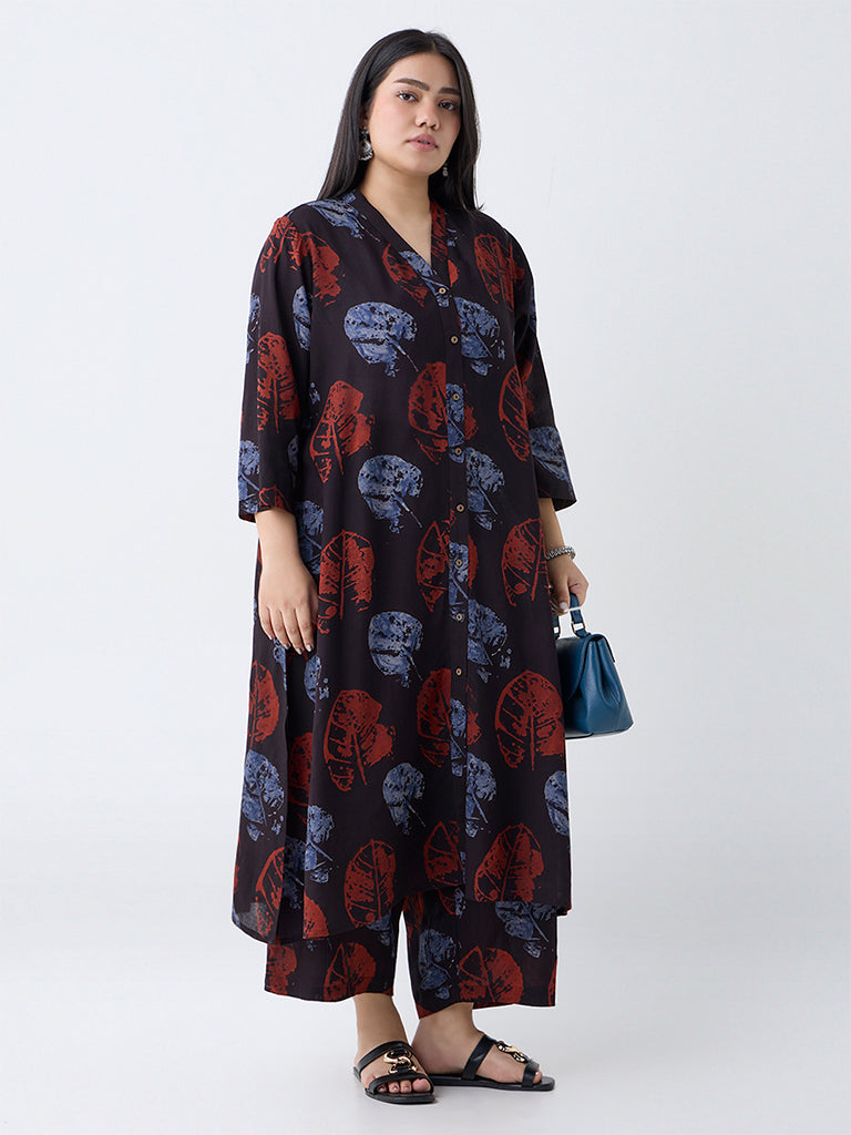 Rejuvenating everyday festive dressing with refined detail, this black kurta by Diza is defined by delicate leaf prints that feel timeless and grounded. Made from breathable fabric in an A-line silhouette, it is finished with a V-neck, three-quarter sleeves and a practical slip pocket.