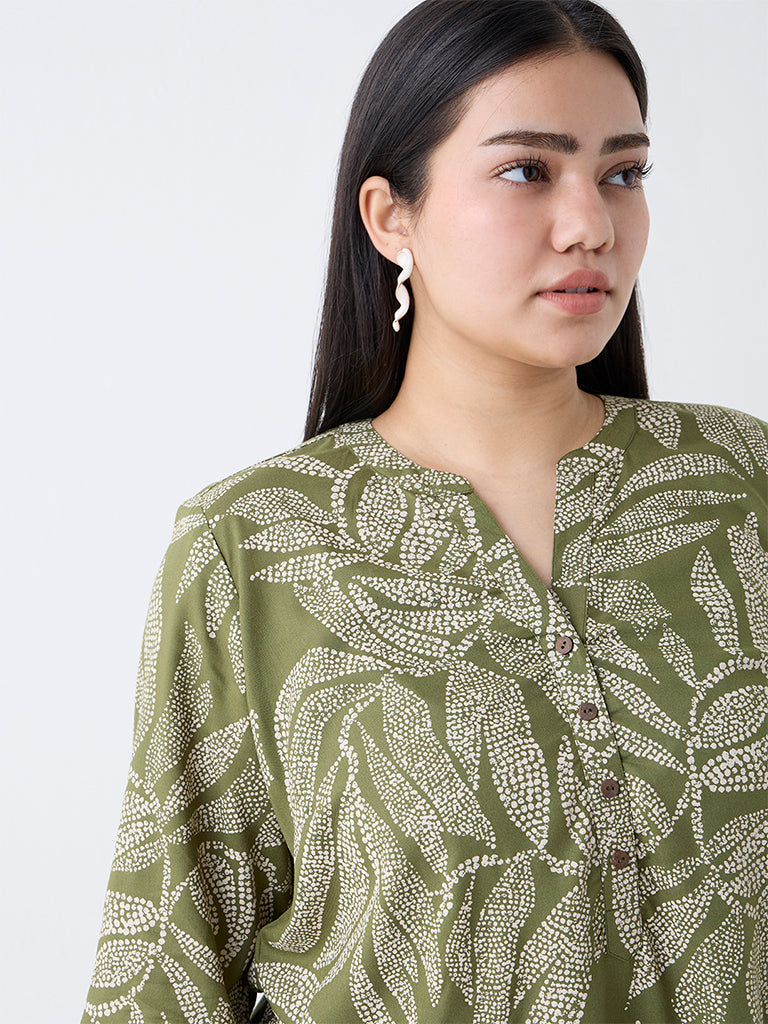 In a soothing hue, this sage tunic from Diza is patterned with leaf motifs for a serene, nature-inspired aesthetic. Milled from a lightweight fabric, it features a notched neck extending to a neat quarter placket and 3/4th sleeves—an ideal choice for understated festive dressing.