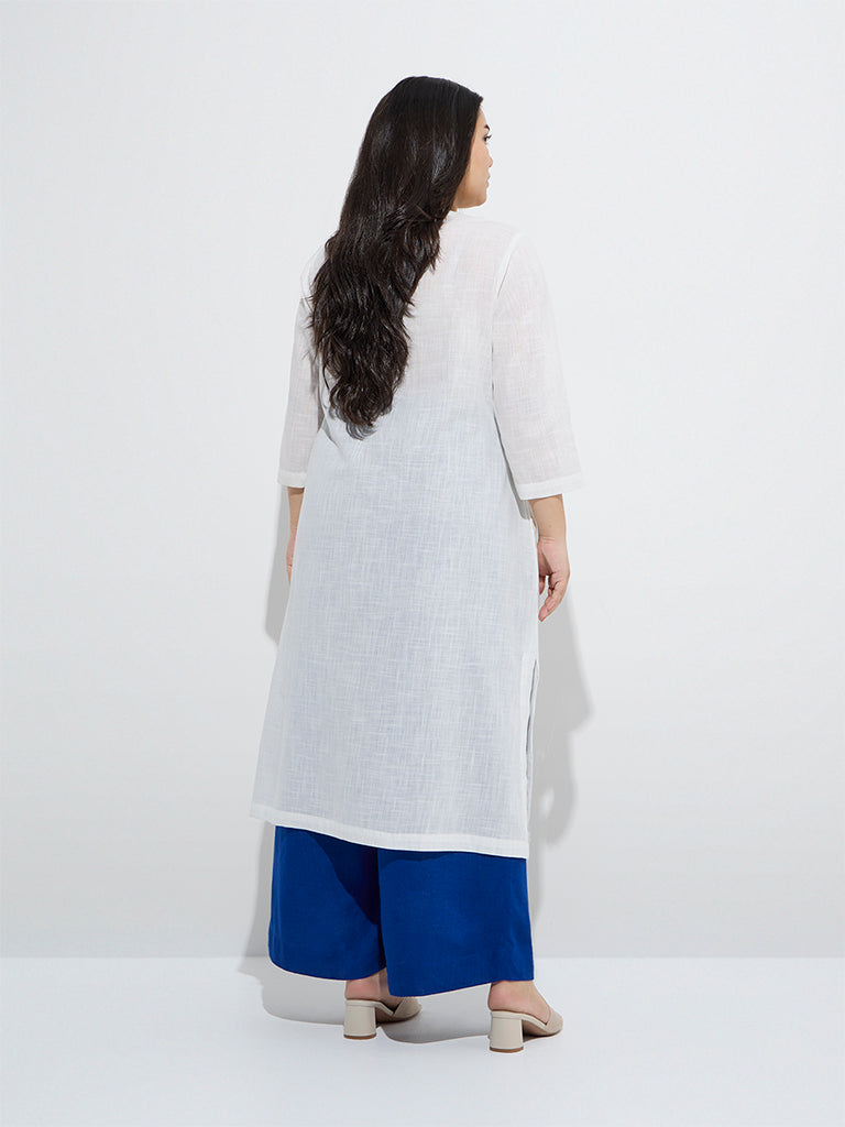 This white kurta from Diza is detailed with Sealife-themed prints, bringing a playful yet elegant touch to your look. Milled from pure cotton, the A-line silhouette is complemented by a round neck, button placket, and three-quarter sleeves. Practical side pockets add a layer of ease to the design.