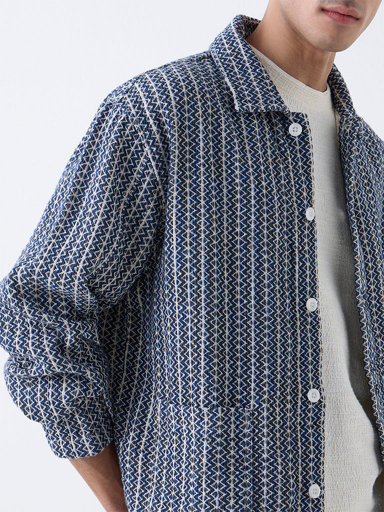This indigo cotton jacket from ETA blends craftsmanship with everyday ease. Designed in a relaxed fit, it features intricate embroidery that adds a refined touch, along with a spread collar, button-down front, full sleeves, and a functional front pocket for a timeless, versatile appeal.