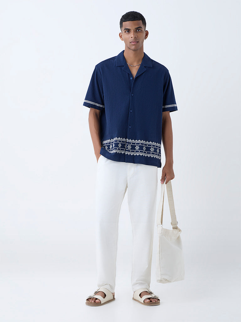 ETA Navy Embroidered Relaxed-Fit Cotton Shirt