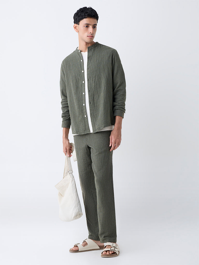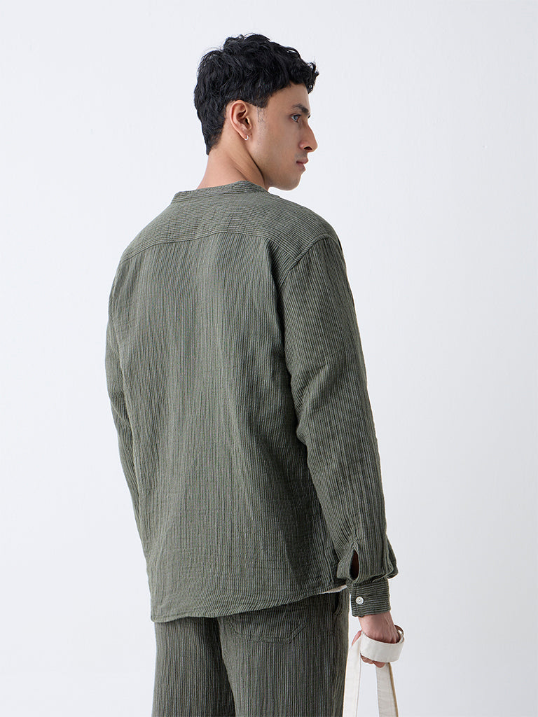 Keep it simple and stylish with this olive striped shirt from ETA. Made from breathable cotton in a relaxed frame, it features a band collar, button-down front, and full sleeves.