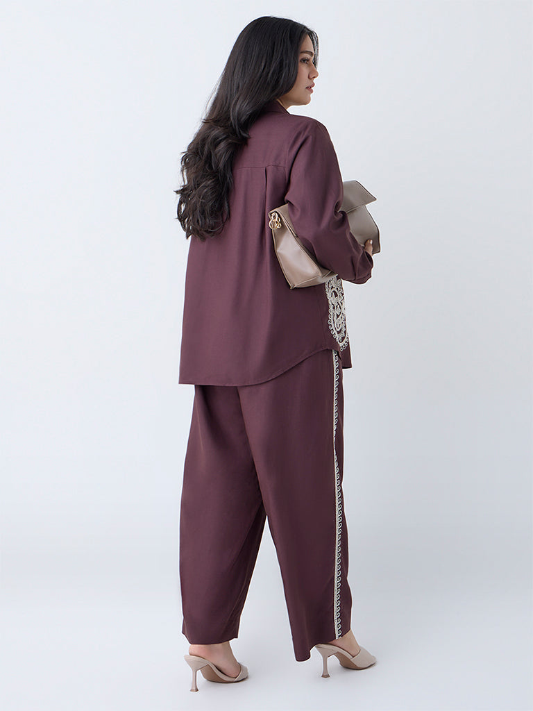 Dark brown Pants by Gia, elevated with intricate side embroidery that adds a refined, elongating effect to the silhouette. Cut from a breathable fabric that moves effortlessly with you, they feature an elasticated waistband for all-day comfort and side pockets for everyday practicality.