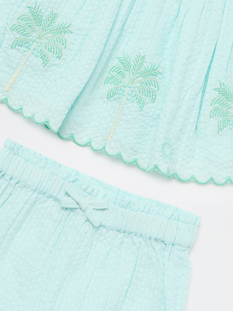 HOP Baby Girls Mint Floral Embroidered Cotton Top and Shorts Set