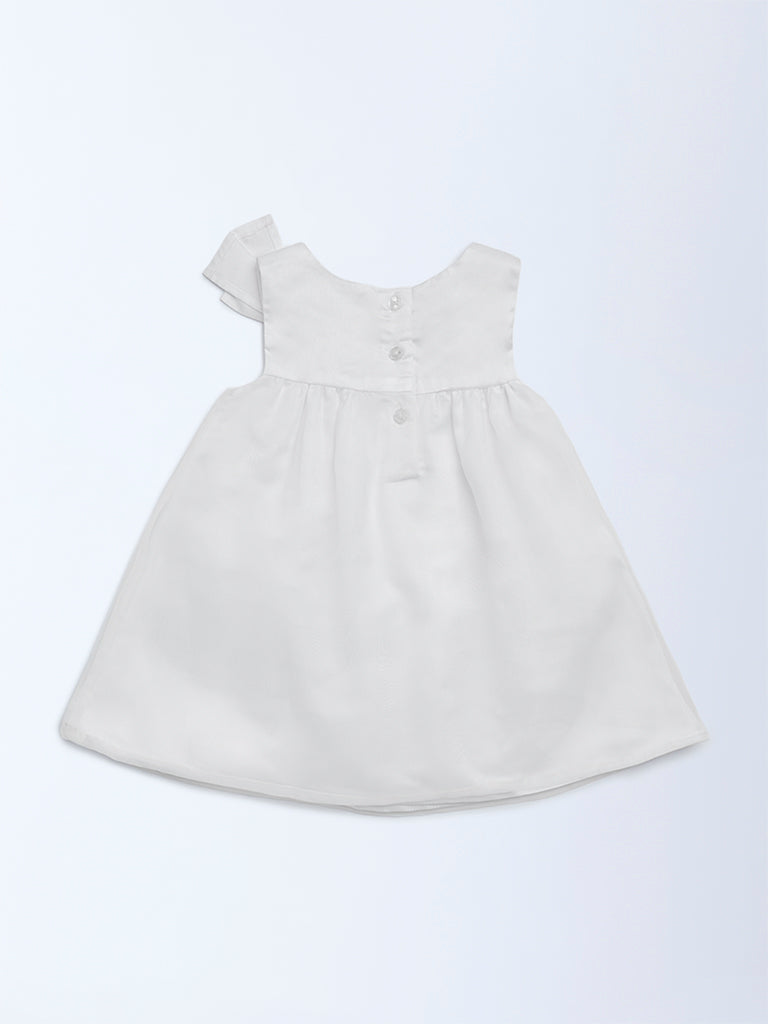 HOP Baby presents this white dress crafted from a premium, soft-touch fabric for an elegant yet comfortable feel. Designed in a fit-and-flare silhouette, it features a dainty bow detail on one shoulder for added charm. Finished with a classic crew neckline and a back button closure for easy dressing.