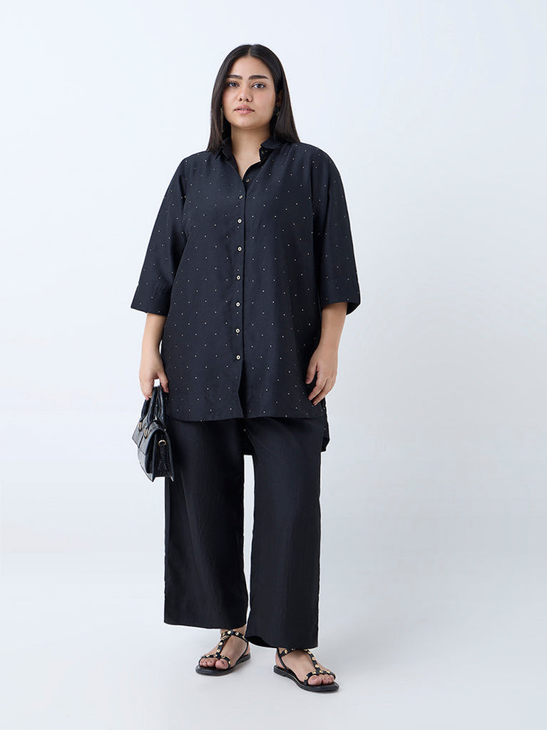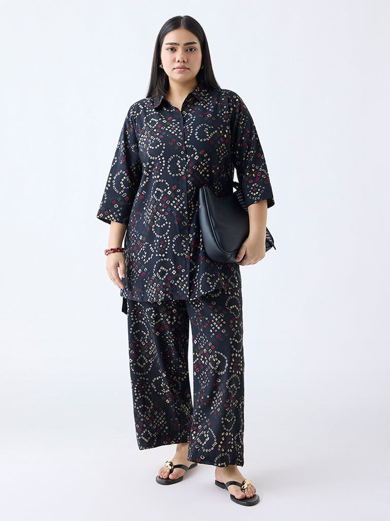 Perfect for everyday wear as well as festive days, this black tunic from Diza will redefine your ethnic edit. Flaunting bandhani-inspired geometric prints, this high-low style gives a chic look with matching palazzos (sold separately)