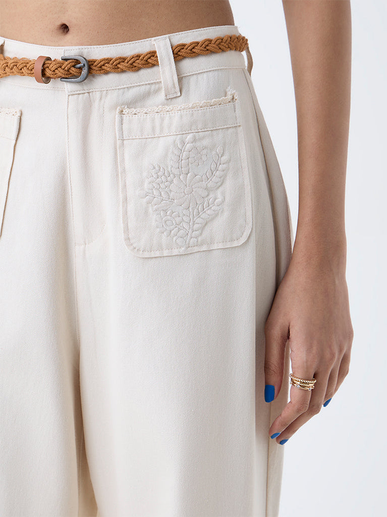 Infuse your day with breezy sophistication in these wide-leg off-white pants by Bombay Paisley. Crafted from pure cotton, they feature belt loops, a button closure, and a zipper placket for a structured yet relaxed fit. The front pockets highlight tonal floral embroidery, adding a subtle touch of artistry, while the braided belt completes the look.