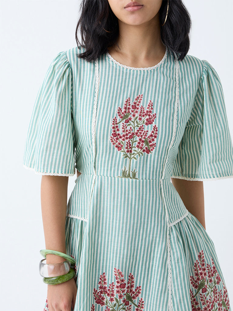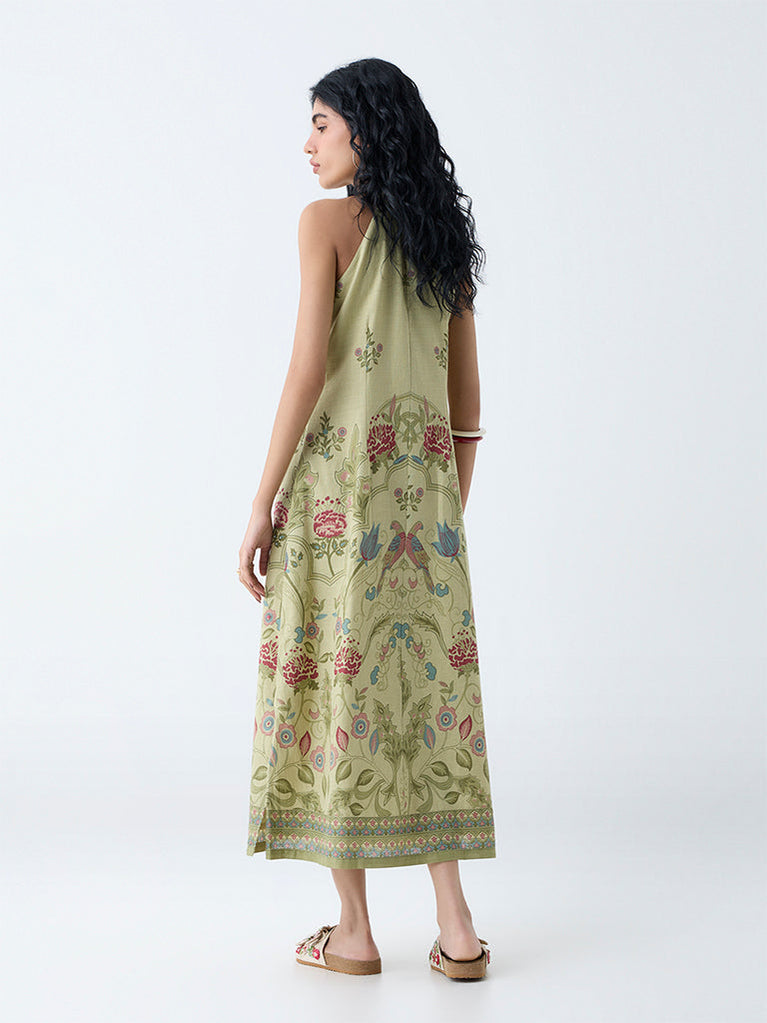 Bombay Paisley Green Floral Detailed Cotton A-Line Dress