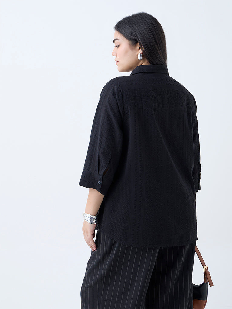 For days when sophistication is non-negotiable, reach for this black shirt from Gia. Spun from pure cotton, it is elevated with a seersucker textured finish and delicate floral embroidery for a feminine touch. A classic collar and button placket keep the look polished, while three-quarter sleeves add versatility.