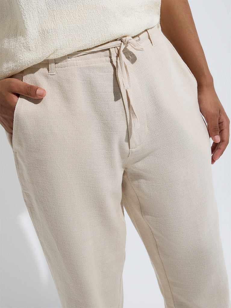 These beige chinos from ETA are tailored from a comfortable cotton-blend fabric in a solid hue. Cut in a relaxed fit, they come fitted with a buttoned waistband, adjustable drawstrings, belt loops, and a zipper fly. Multiple pockets add a practical touch to this laid-back essential.