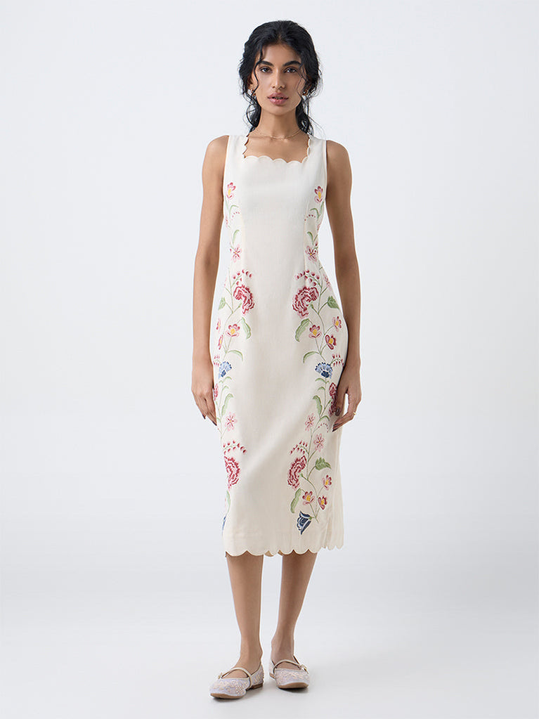 Bombay Paisley brings a bright update to daytime dressing with this cream dress, defined by vivid floral printed panels that add colour and movement. The straight silhouette is styled with a square neck, scalloped straps and coordinating scalloping at the hem for a handcrafted finish. Made from a breathable cotton-rich fabric and secured with a back zipper, it is an easy choice for relaxed summer plans.