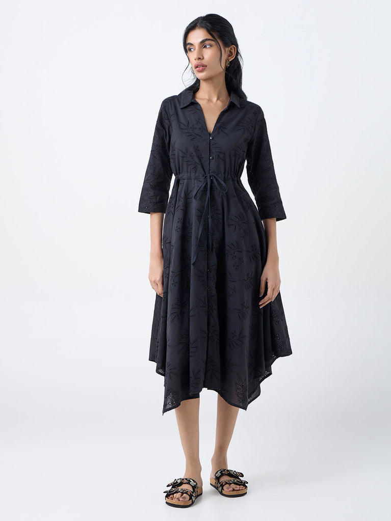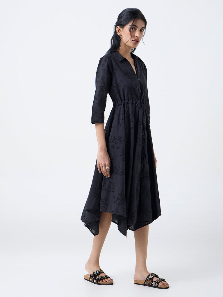 Bombay Paisley redefines everyday elegance with this pure cotton black asymmetric dress, delicately embroidered with schiffli motifs for a refined, textural finish. A V-neck collar flows into a button placket, complemented by 3/4 sleeves for relaxed sophistication. The elasticated drawstring waist offers a flattering cinch, while side pockets add effortless practicality.