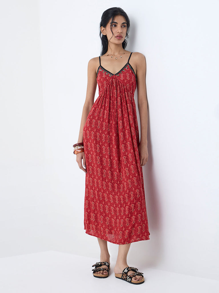Radiate effortless elegance in this red empire-line dress from Bombay Paisley, decorated with traditional-inspired prints that add movement and depth. The embellished detailing enhances the neckline with subtle festive shimmer, while adjustable straps ensure a secure, personalised fit. Milled from a lightweight fabric, this dress is ideal for warm celebratory evenings, day-time gatherings or holiday travel.