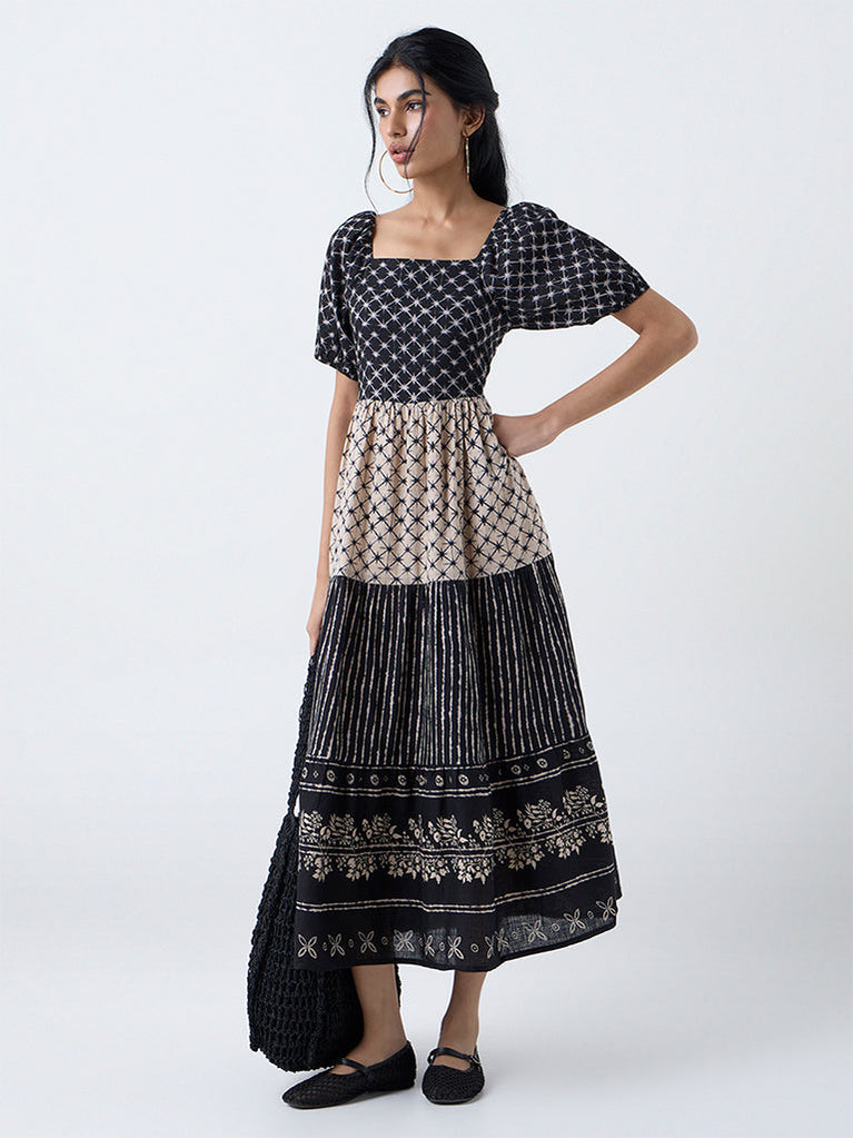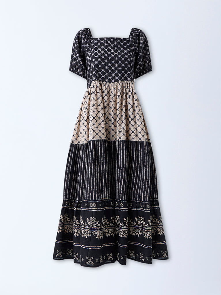 Easy, breezy and made for sunny days, this black dress from Bombay Paisley sets a relaxed holiday mood. Crafted from a soft cotton-rich fabric, the bodice features charming embroidery, while the tiered frame blends contrasting ethnic prints for a playful visual mix. Finished with a square neck and adjustable straps, it is the perfect throw-on piece for brunches, strolls or carefree weekend plans.