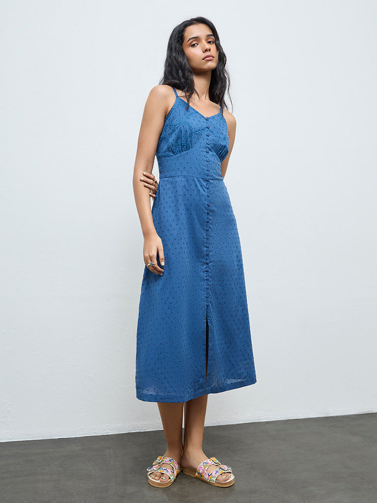 This indigo dress from Bombay Paisley stands out through its all-over swiss-dot embroidery. Constructed from breathable cotton fabric, it is shaped in an A-silhouette that keeps the focus on the surface detail. The V-neck, button-up front adjustable straps and a smocked back maintains a streamlined profile, making it a confident pick for daytime dressing.
