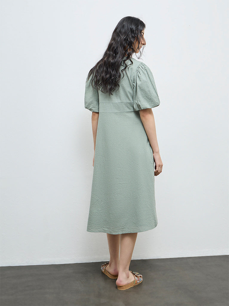 Highlight understated elegance in this sage Bombay Paisley dress, adorned with floral embroidery across the front. Crafted from pure cotton, it is shaped in a flowing A-line silhouette with a V-neck and softly puffed sleeves, lending a handcrafted, vintage-inspired feel to everyday dressing.