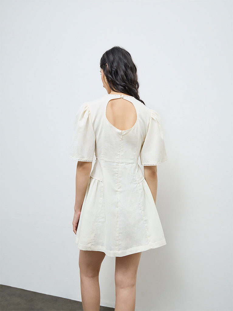 Keep things light and romantic in this off-white dress by Bombay Paisley, scattered with subtle floral motifs. Designed in an airy A-line silhouette using a breathable fabric, it features a clean round neckline and soft angel sleeves. A cut-out detail at the back adds a hint of modern charm.