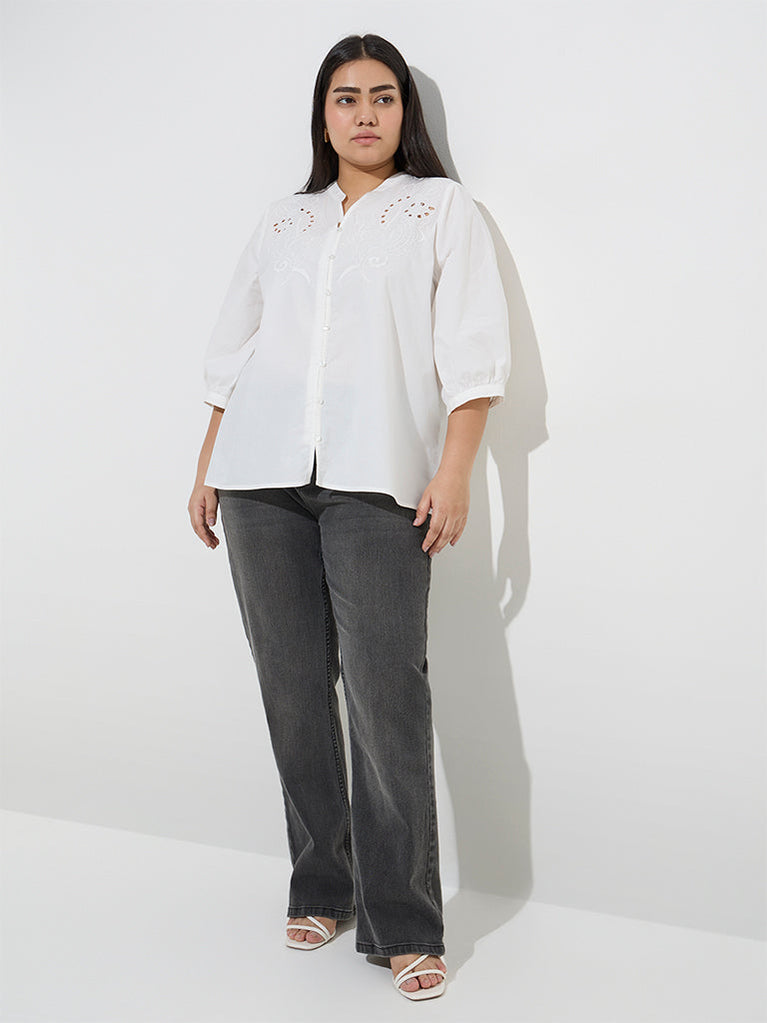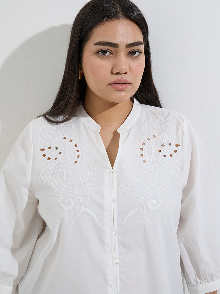 This white blouse from Gia combines delicate embroidery with a timeless silhouette. Featuring a mandarin neckline that extends into a button placket and three-quarter sleeves, it offers an elegant yet effortless charm.