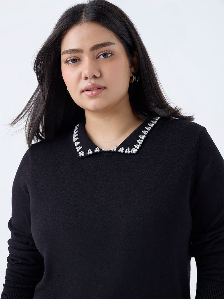 Crafted in a classic black hue, this stretchable top by Gia features delicate pearlescent detailing along the spread collar for an elegant touch. Designed in a soft fabric with full sleeves, it offers a refined silhouette that transitions seamlessly from workwear to evening outings.