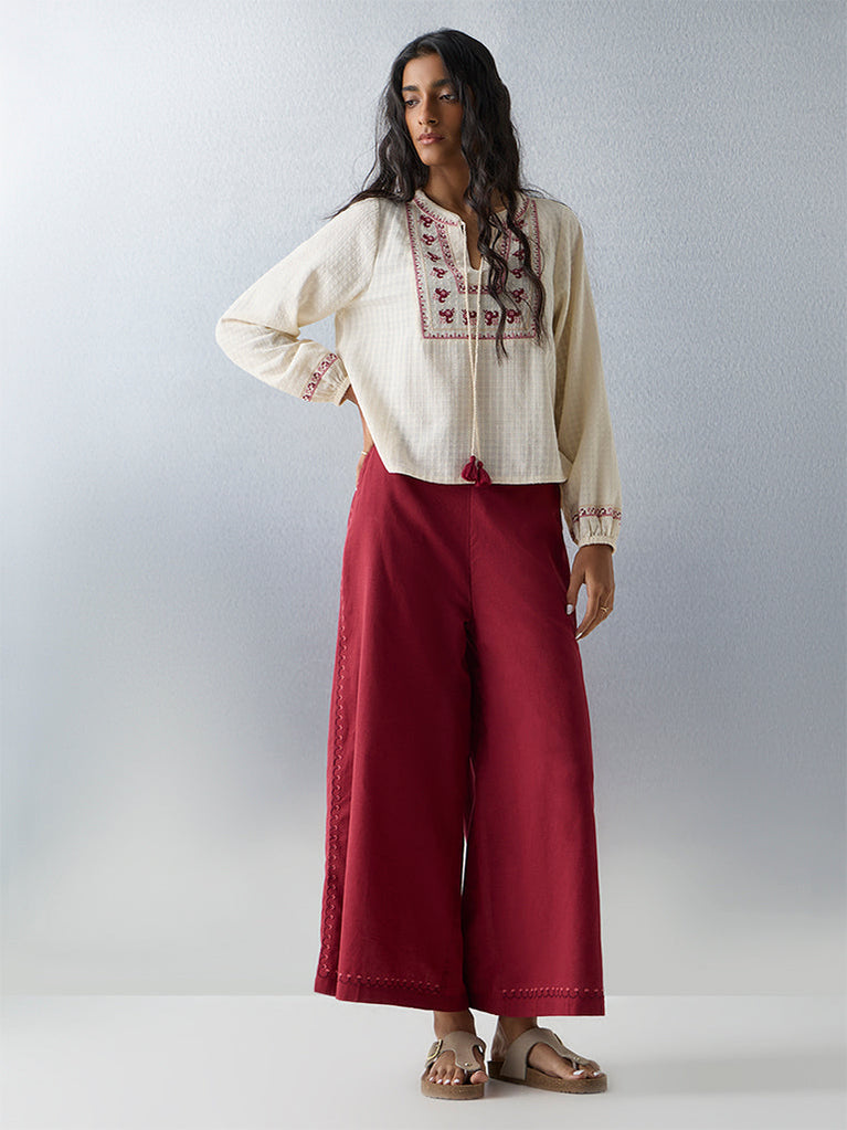 This off-white top from Bombay Paisley is crafted from breathable cotton with a subtle texture. Detailed with delicate embroidery, it features a split neck with a tassel-detailed tie-up for added style. Finished with blouson sleeves, it blends artisanal charm with everyday elegance.