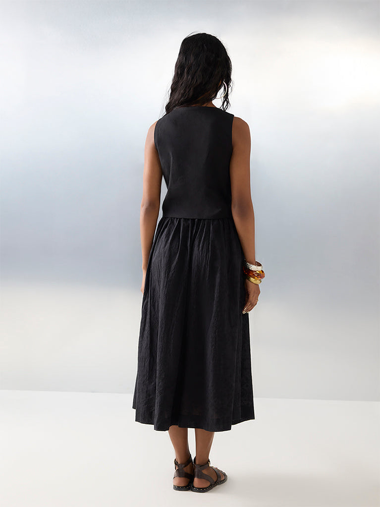 Bombay Paisley brings this black top woven from a cotton-blend fabric, promising day-long comfort. The front design features striking floral embroidery and tie-up details. Framed with a round neck and a sleeveless cut, it adds a refined edge to casual festive dressing.