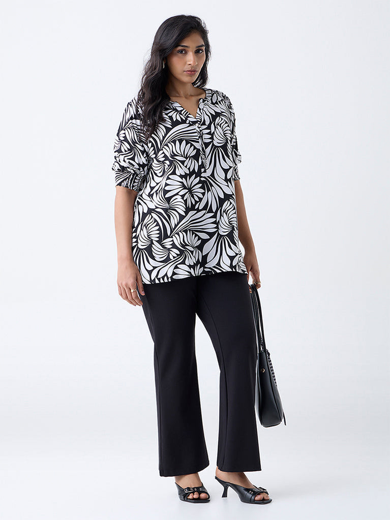 Gia presents this black blouse designed with a notched neck with a brief button placket and puff sleeves for a soft, structured look. Spun from lightweight fabric, it offers a smooth feel while showcasing striking floral prints that lend character to the design.