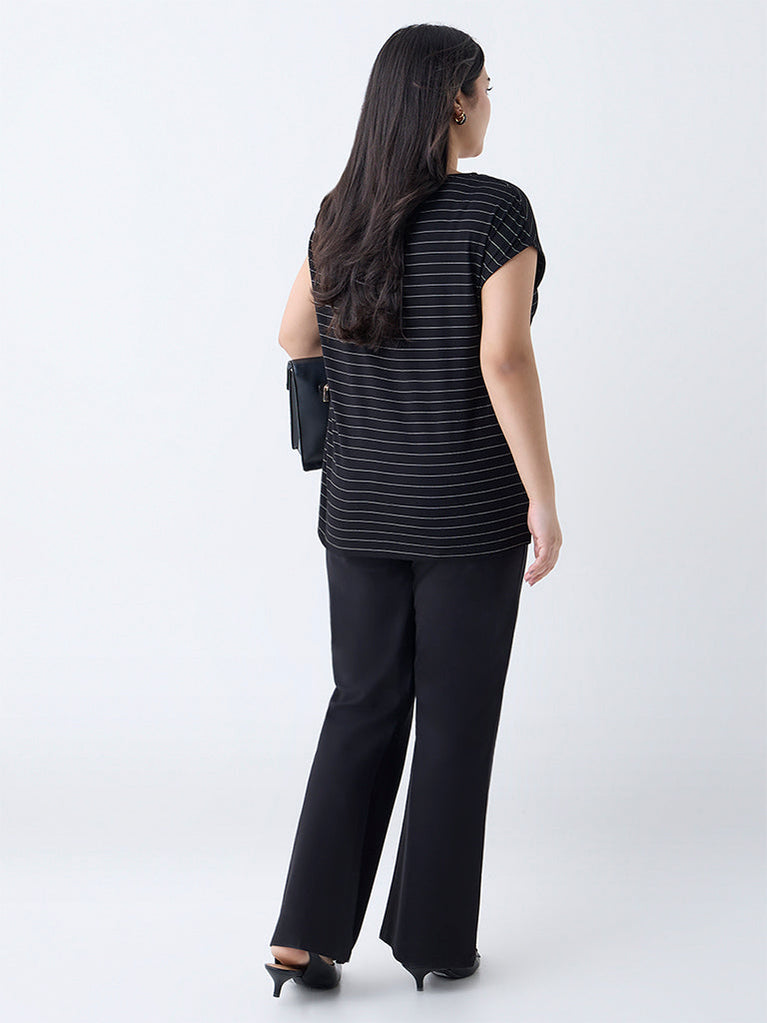 Gia introduces a black top that balances minimalism with standout detailing. A gold-toned hardware near the boat neck gives it an edgy lift, while dolman sleeves add relaxed volume for effortless ease. Created from a lightweight fabric with subtle pinstripes, the t-shirt drapes fluidly, making it a versatile piece for casual or semi-polished styling.