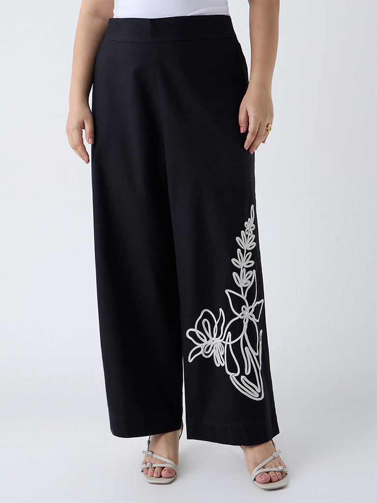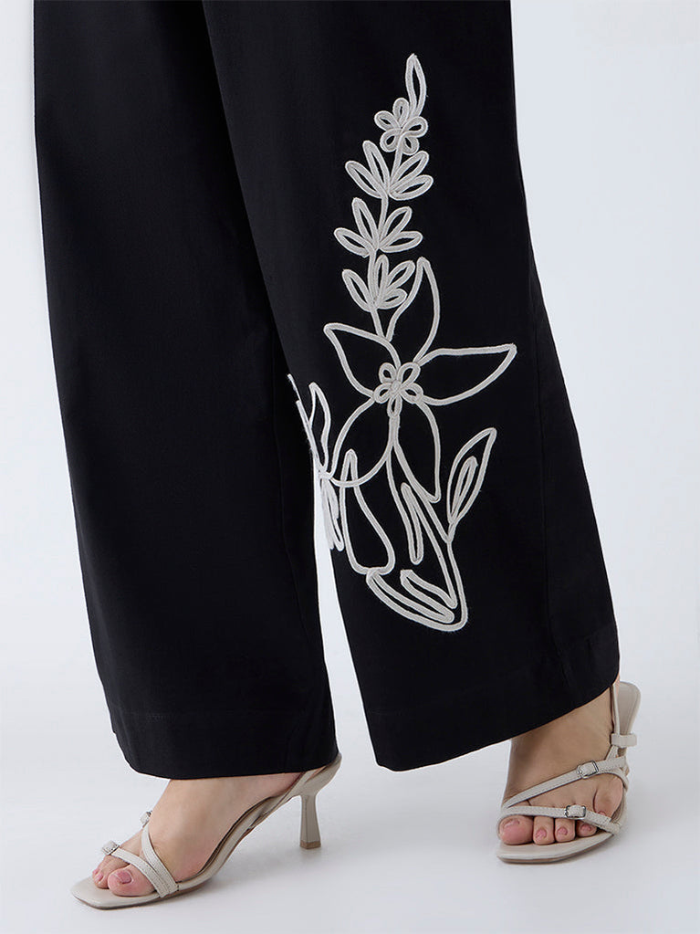 Gia Black Floral Embroidered Cotton-Blend Trousers