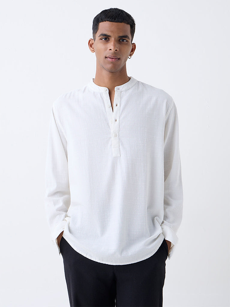 Add understated elegance to your lineup with this off-white shirt from ETA. Framed in a relaxed fit, it is styled with a band collar, a short button-up front and full sleeves. Crafted from a breathable fabric featuring a subtle self-patterned finish, it’s an ideal pick for elevated everyday dressing.