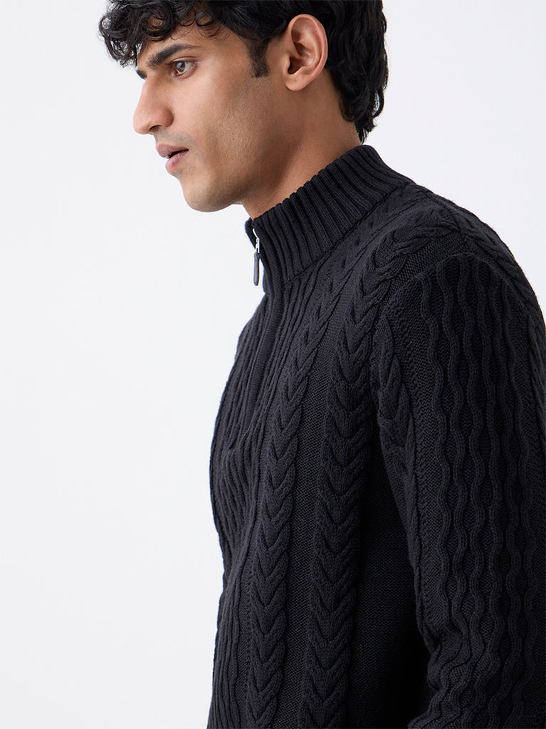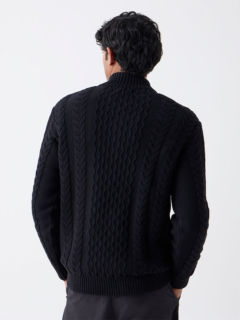 Rich in texture and classic in appeal, this black cable-knit sweater by Ascot is made from pure cotton for natural warmth and breathability. Featuring a high neck with a short zip closure and full sleeves, it balances structure with ease.