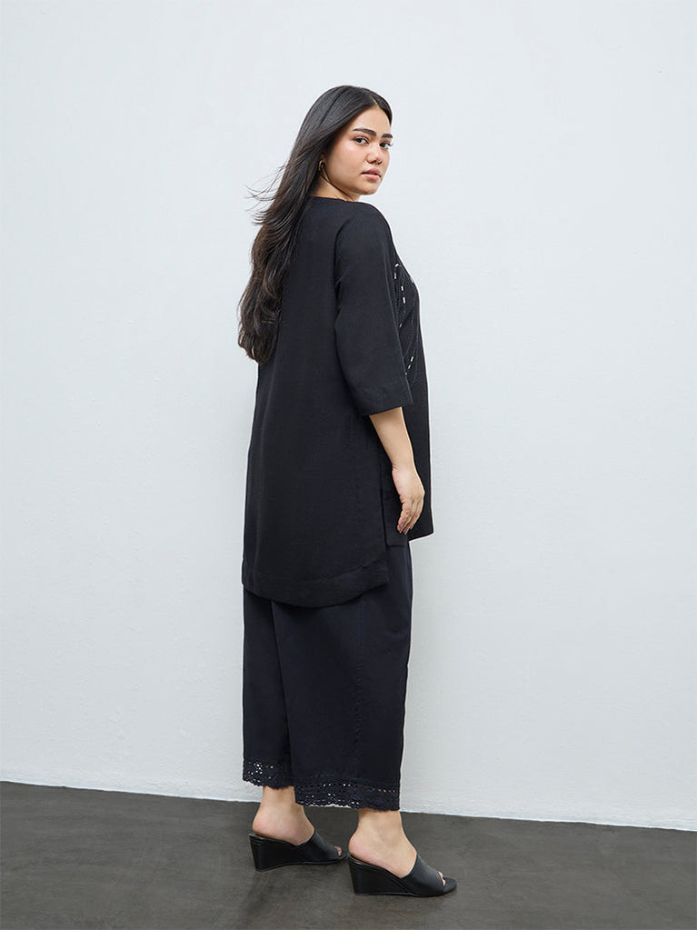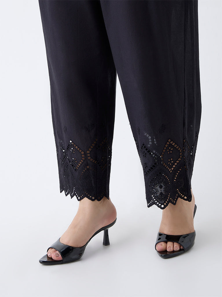 A versatile accompaniment to elegant kurtas and tunics, these black ethnic pants from Diza are crafted to refine any ensemble. The intricate schiffli embroidery at the hem adds a touch of craftsmanship, while the smooth elastane waistband with adjustable drawstrings ensures a comfortable and flattering fit.