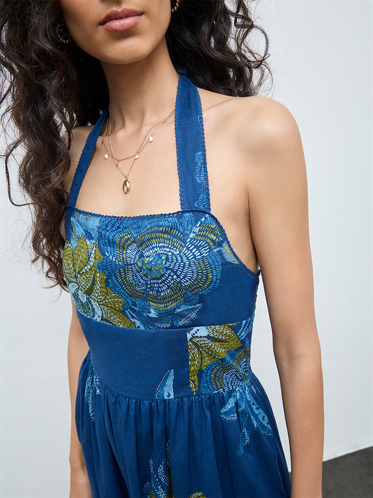 Bombay Paisley presents this dark blue dress adorned with delicate floral embroidery for a timeless boho finish. Crafted from pure cotton, it is shaped in a flattering A-line silhouette with a halter neckline that ties at the back. The smocked back ensures a snug yet comfortable fit, while two side pockets add ease for laid-back days and holiday outings.