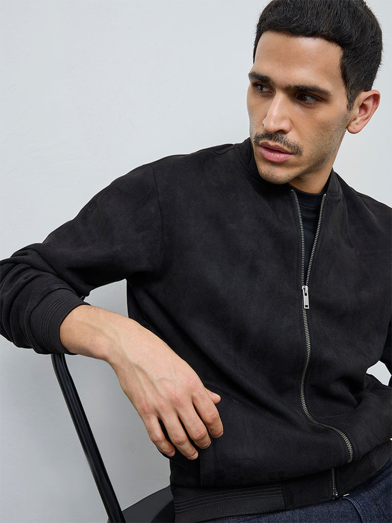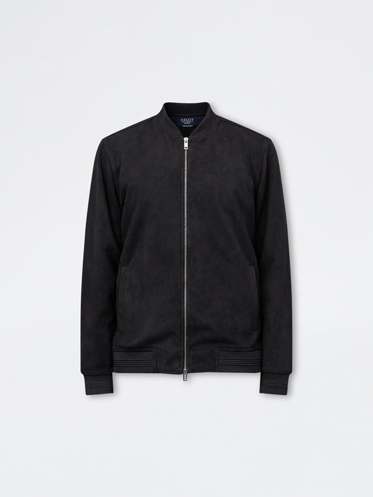 Ascot redefines modern outerwear with this black bomber jacket, finished in a refined suede texture. Cut in a relaxed yet structured handle, it features a mock collar and a clean full-zip front for a streamlined profile. Ribbed detailing at the cuffs and hem lends classic bomber character, making it a versatile layering piece with a luxe edge.