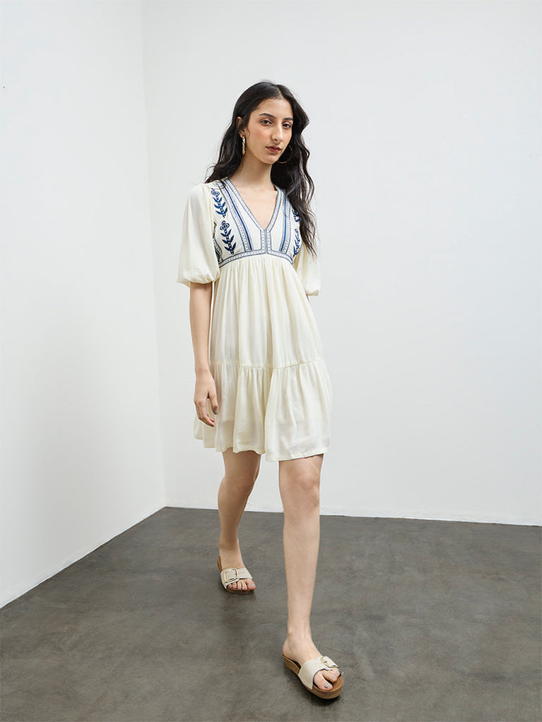 Unveil soft romanticism with this cream dress from Bombay Paisley, defined by an intricately embroidered floral yoke. The V-neckline flows into voluminous blouson sleeves, adding movement and ease, while the tiered silhouette lends a fluid, free-spirited drape ideal for sunlit outings and relaxed gatherings.