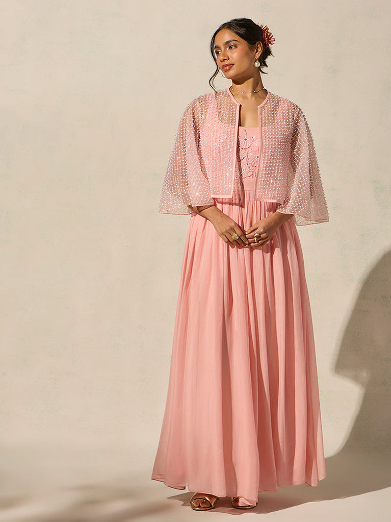 Softly luminous and effortlessly refined, this pink cape adds a graceful finishing layer to festive ensembles. Crafted from a sheer mesh fabric and detailed with delicate beadwork throughout, it brings texture and lightness without overwhelming the look. The relaxed silhouette and angel sleeves allow it to drape fluidly over dresses and coordinated sets.