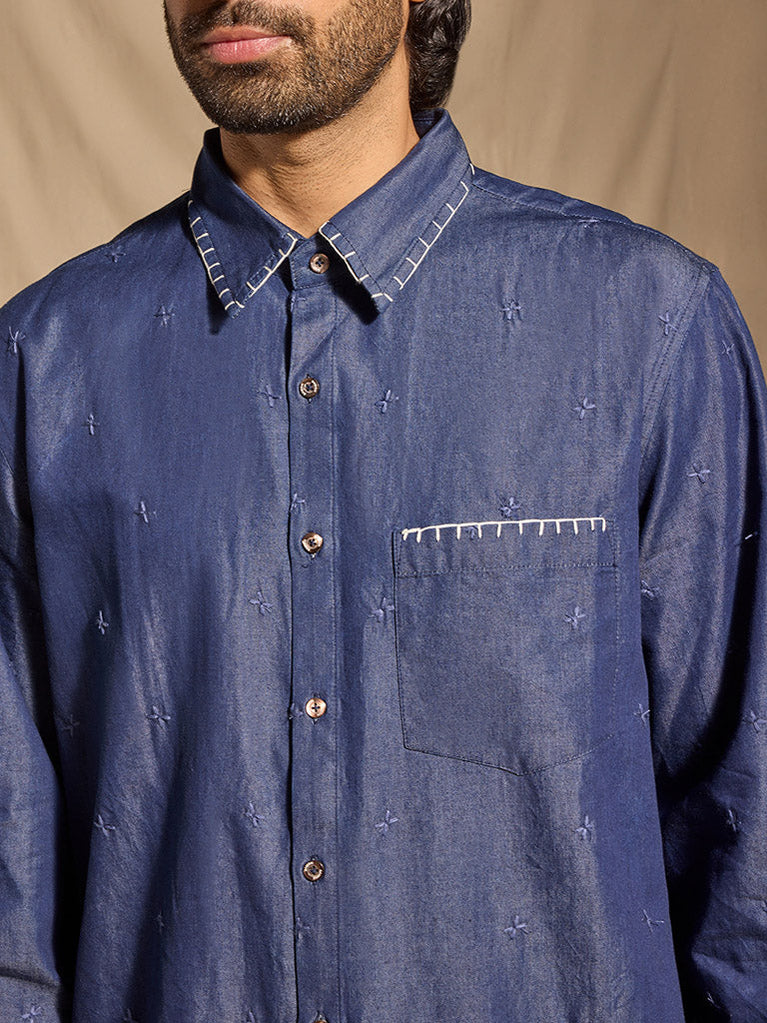 Relaxed in spirit yet thoughtful in detail, this blue shirt settles naturally into weekend wear. Crafted from lightweight chambray, it offers a breathable feel, while intricate embroidery adds character. Contrast stitch detailing at the collar and chest pocket lends a handcrafted finish. Designed with a classic button-down front and full sleeves, it layers easily over a tee or wears just as well on its own.