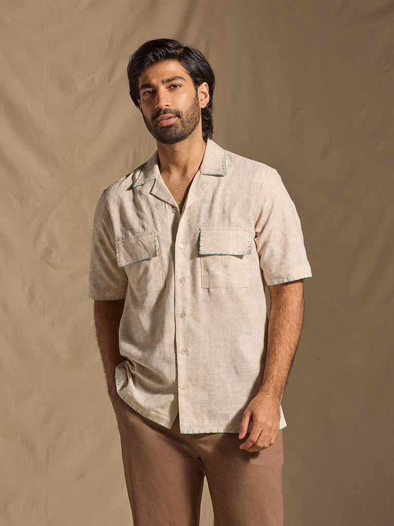 An expression of relaxed sophistication, this beige shirt is defined by its tactile details and easy silhouette. Cut from a breathable fabric, it showcases understated woven motifs and contrast stitch finishes that elevate its minimal design. The camp collar and short sleeves reinforce its effortless appeal, while functional patch pockets complete the look with a practical edge.