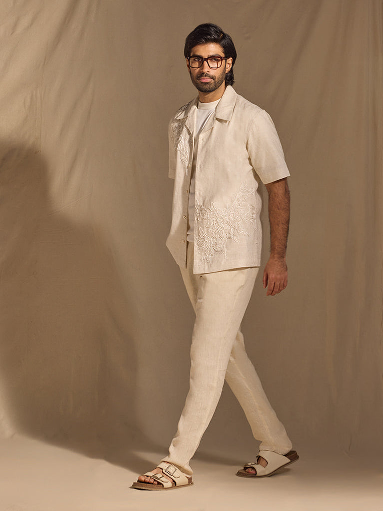 Carry a relaxed rhythm through lunches, evenings, and travel days with this off-white shirt. Spun from a lightweight fabric, it sits comfortably on the skin and feels easy through long hours of wear. Intricate embroidery introduces texture without overpowering the design, while the camp collar keeps the look fluid and classy. Finished with short sleeves and a button-down front, it styles effortlessly on its own or as part of a coordinated set.