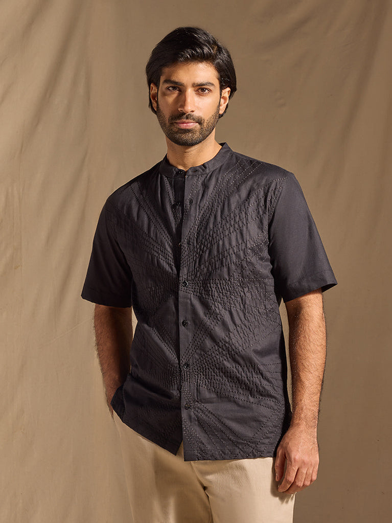 Navigate your day with quiet confidence in this black shirt. Crafted from a breathable fabric, it features intricate embroidery across the front that adds depth without overpowering the look. The streamlined silhouette and short sleeves ensure comfort through long hours, while the band collar lends a modern finish.