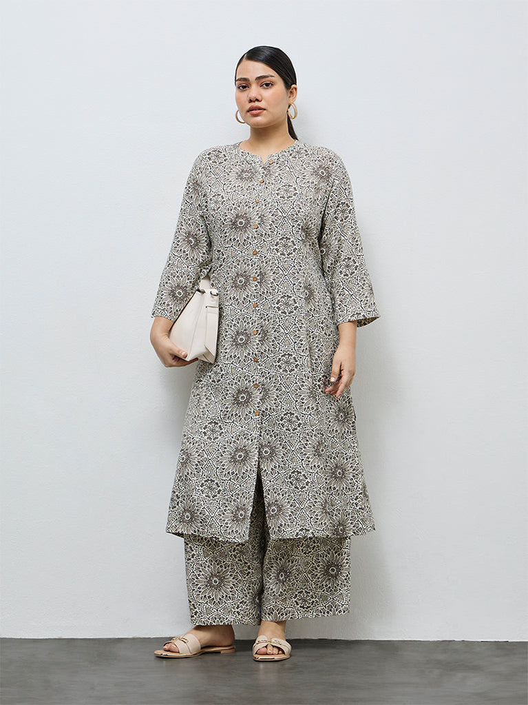 Float through the day in this white Diza kurta, detailed with delicate leaf patterns for a soft, nature-inspired look. Cut in an A-line silhouette from a breathable fabric, it features a refined band-neck collar, a buttoned placket, and three-quarter sleeves. A discreet slip pocket adds everyday ease to this thoughtfully designed ethnic staple.