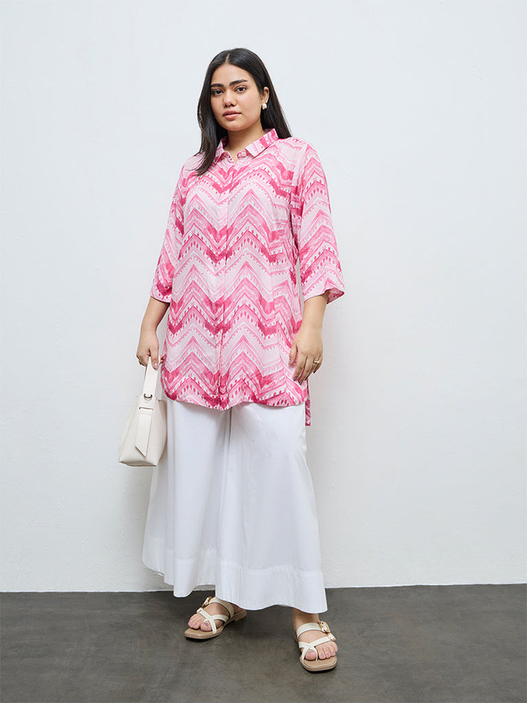 Infused with colour and comfort, this pink tunic from Diza showcases chevron prints that add rhythm and movement to the design. Crafted from a breathable fabric, it is styled with a collar and buttoned placket, balanced by three-quarter sleeves and a high-low hemline for an effortlessly flattering silhouette.