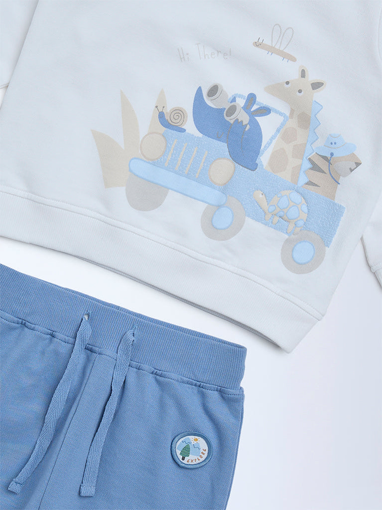 HOP Baby launches this cosy off-white two-piece set made from a soft cotton-blend fabric for everyday comfort. The sweatshirt is designed with a round neckline, full sleeves and adorable animal embroidery, while the matching joggers feature an elasticated waistband and practical pockets—perfect for relaxed play and lounging.