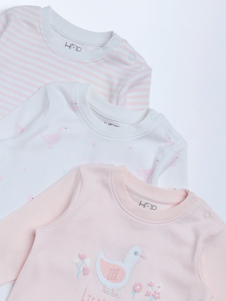This pack of three t-shirts from HOP Baby is crafted from soft, breathable cotton to keep little ones comfortable all day. Featuring a mix of playful animal prints and stripes in cheerful pink tones, these versatile tees are finished with a crew neckline, full sleeves and snap-button shoulder closures for easy dressing.